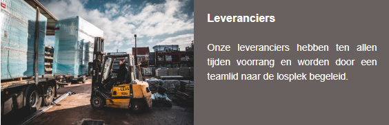 - Laad uw materialen zelf in. Indien nodig zal de magazijnier met de heftruck laden.