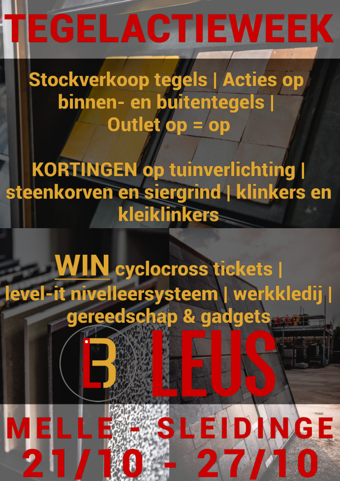 Tijdens de week van 21 oktober kan je bij Leus in Melle en Sleidinge terecht voor een stockverkoop tegels en extra kortingen op binnen- en buitentegels, tuinverlichting, steenkorven en siergrind, klinkers en kleiklinkers.