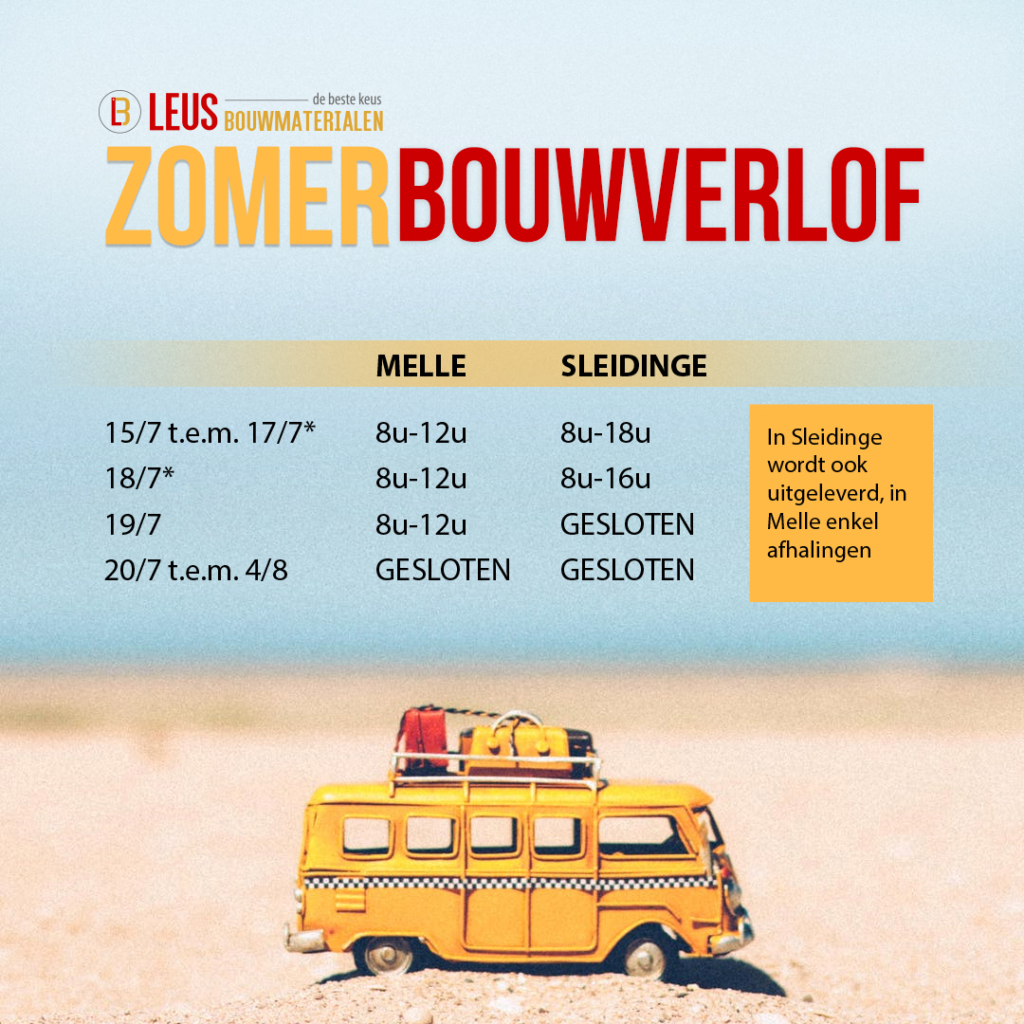 Tijdens de week van 15/7 t.e.m. 18/7 kan je terecht voor afhalingen in beide filialen. In Sleidinge wordt ook uitgeleverd. Wens je echter nog materialen te bestellen voor afhaling of levering, wacht niet te lang. De ritten zijn allen reeds op voorhand gereserveerd en ingepland.
